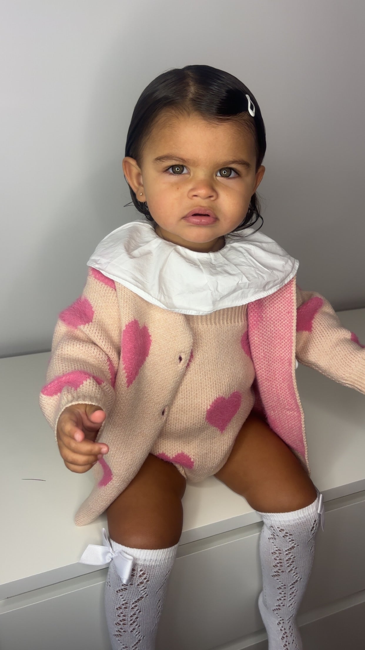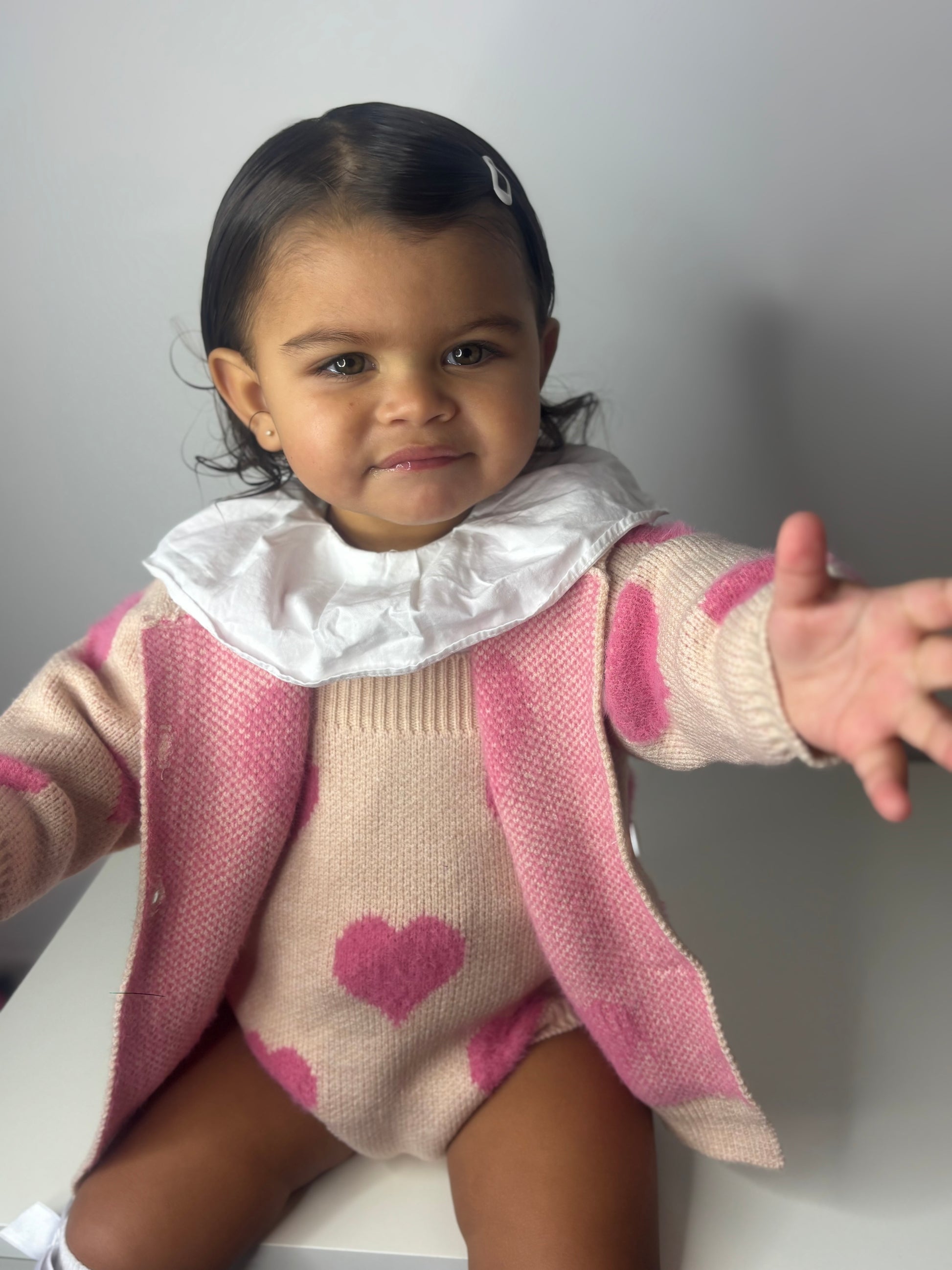 This beautifully knitted two-piece features an all-over heart design in delicate blush tones, blending comfort with timeless charm. The cardigan is finished with classic button detailing, while the matching romper offers a soft, cosy fit — perfect for special moments and everyday magic alike.